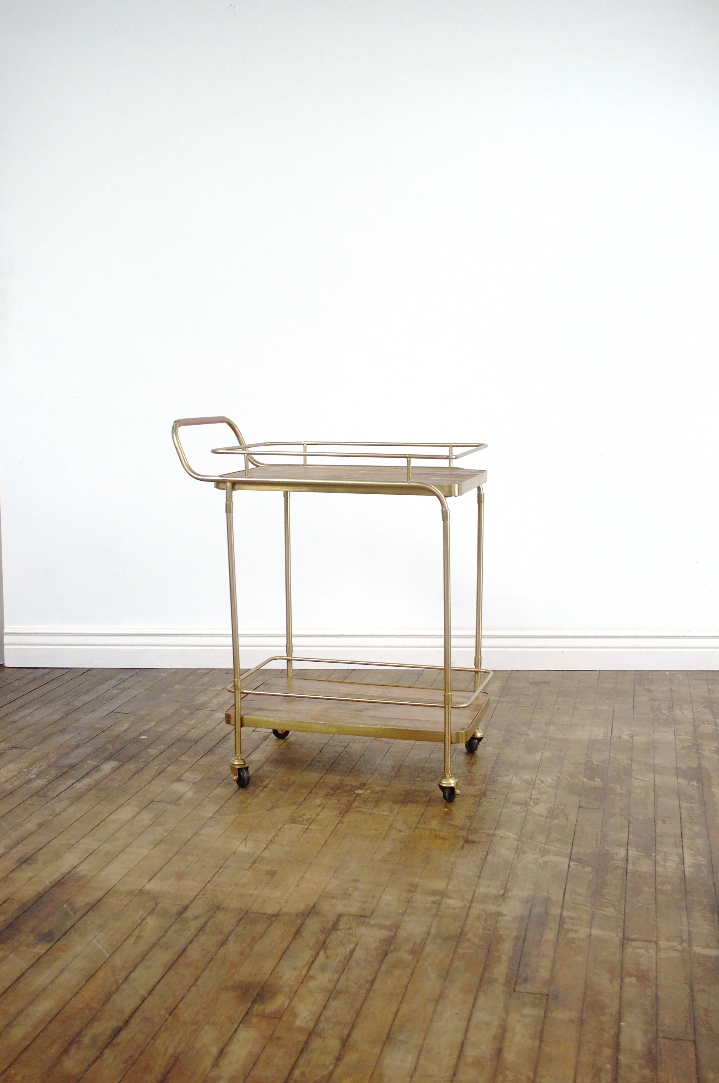 The Christina Bar Cart is a modern piece with a vintage soul. Made with wood, brass and a leather handle, it makes a lovely addition to a bar set-up or as an accent table.