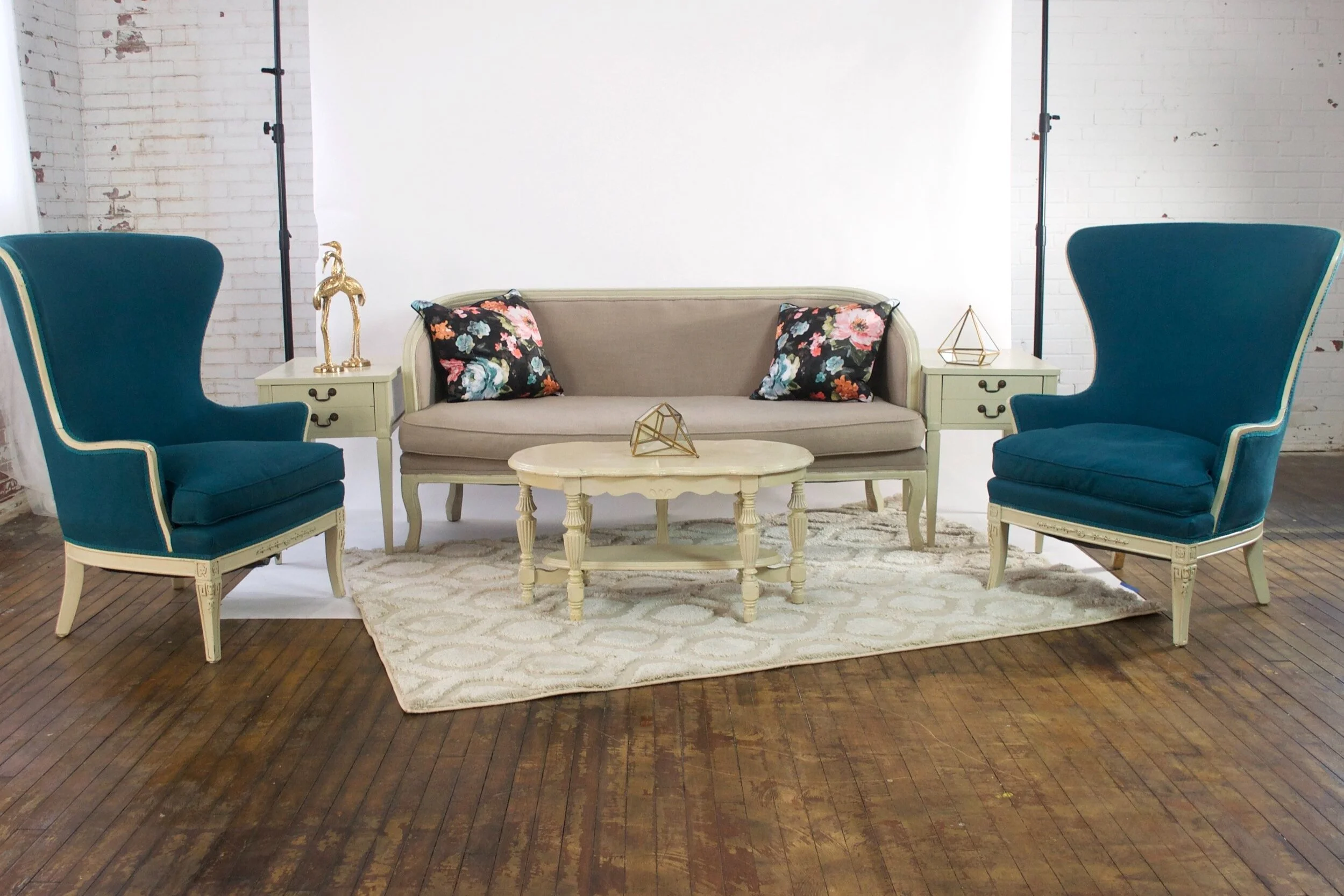 Feat. emerald settee, bonnie chairs, hammered brass coffee table, marble top side tables, champagne rug, bolster pillows