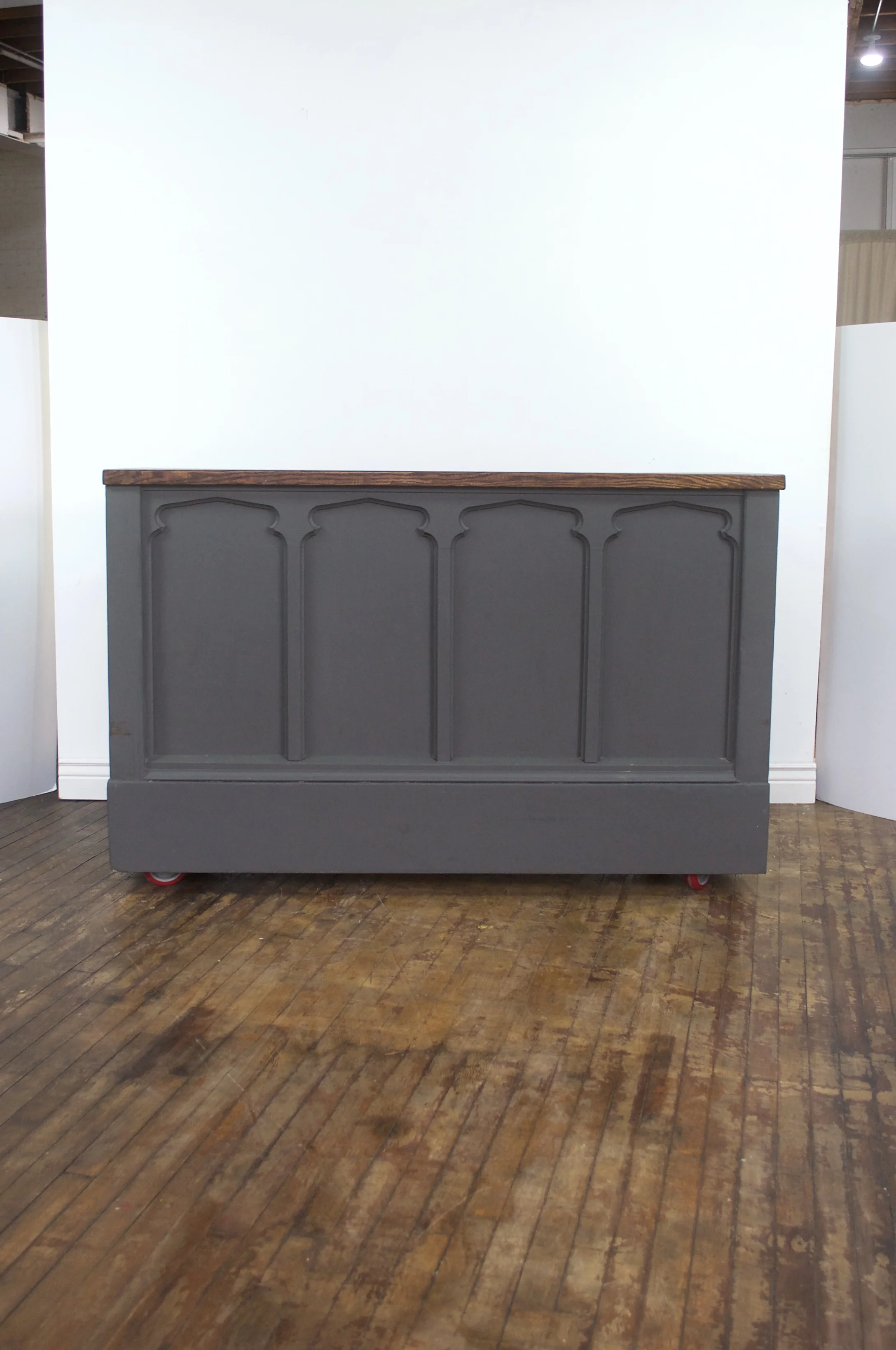 Our Samuel Bars have been handcrafted out of reclaimed pew screen. They have been painted a charcoal grey that coordinates with any style. They are each five and a half feet long. When combined, they provide almost eleven feet of bartending space. Inside they have 17 inch deep shelves, and they are on large, locking, castor wheels for ease of movement.