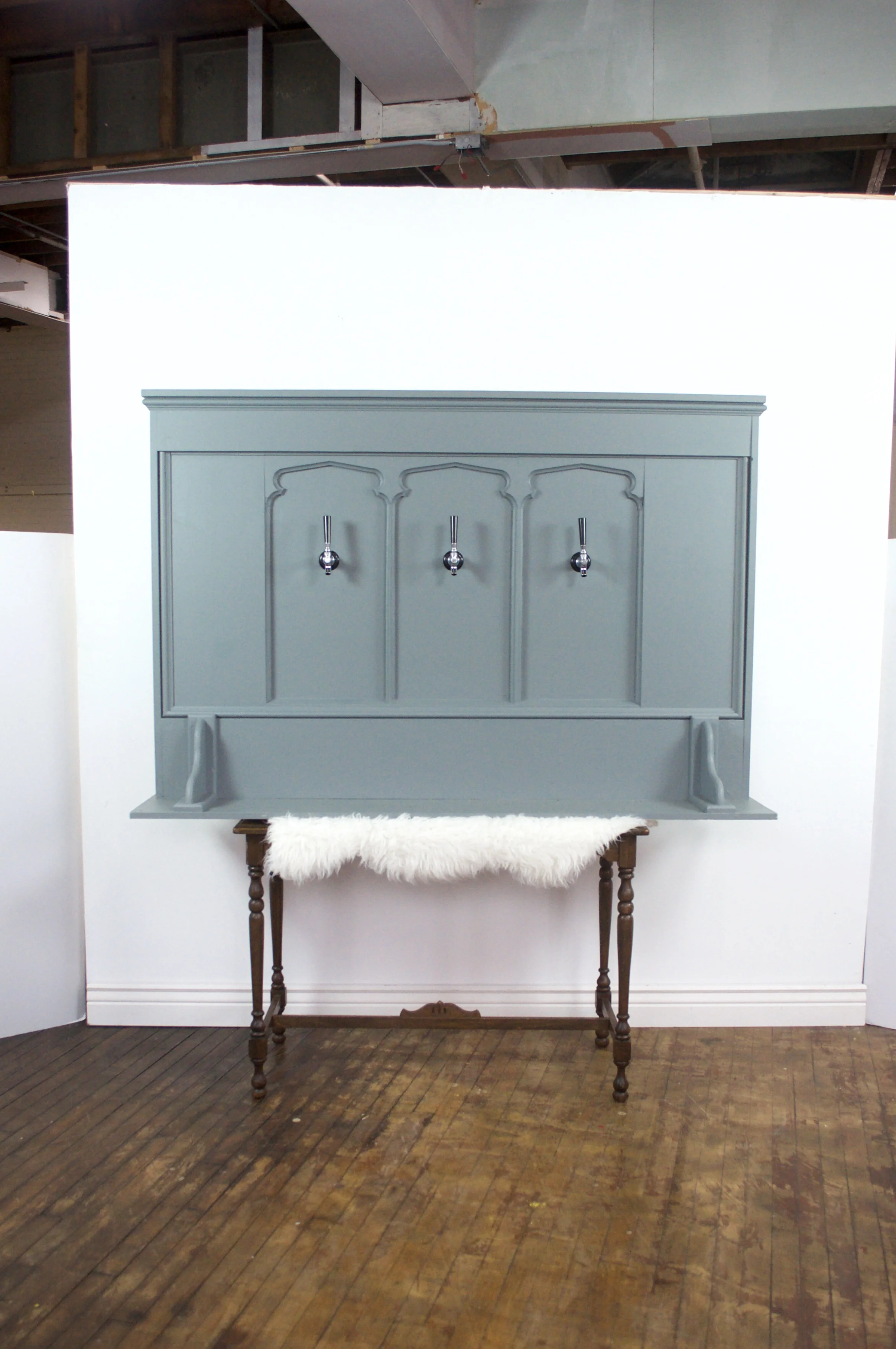 The Tabletop Tap Wall is handcrafted from reclaimed antique pew screens. It is painted a slightly lighter shade of charcoal grey and coordinates with our Samuel Bars. It is five and a half feet long at the base. It should be placed on a sturdy table.