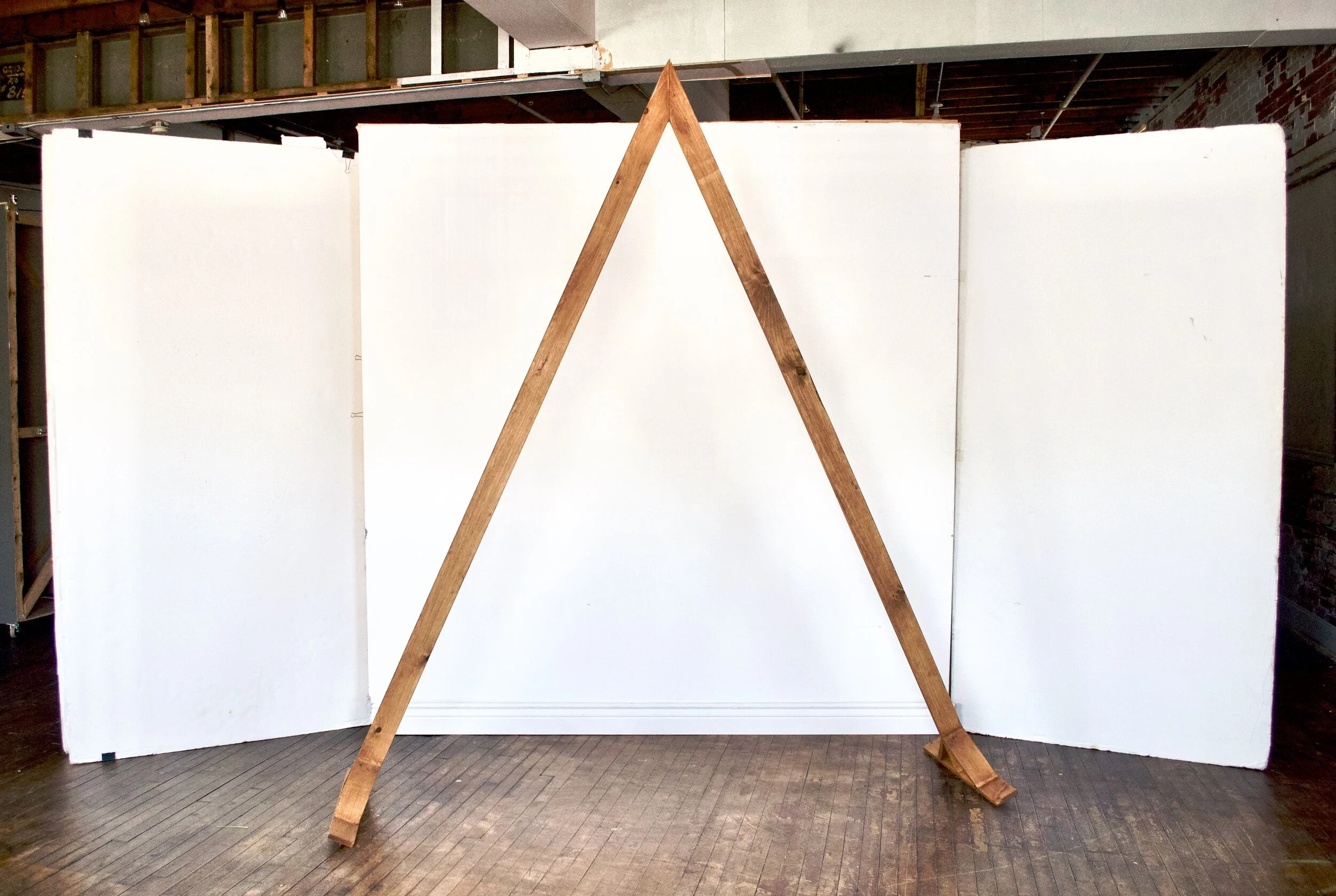 Our triangular arbor is easily transportable. It comes in two pieces that attach by a hinge pin at the top back of the arbor. It makes a statement as a wedding piece or other backdrop for your space.