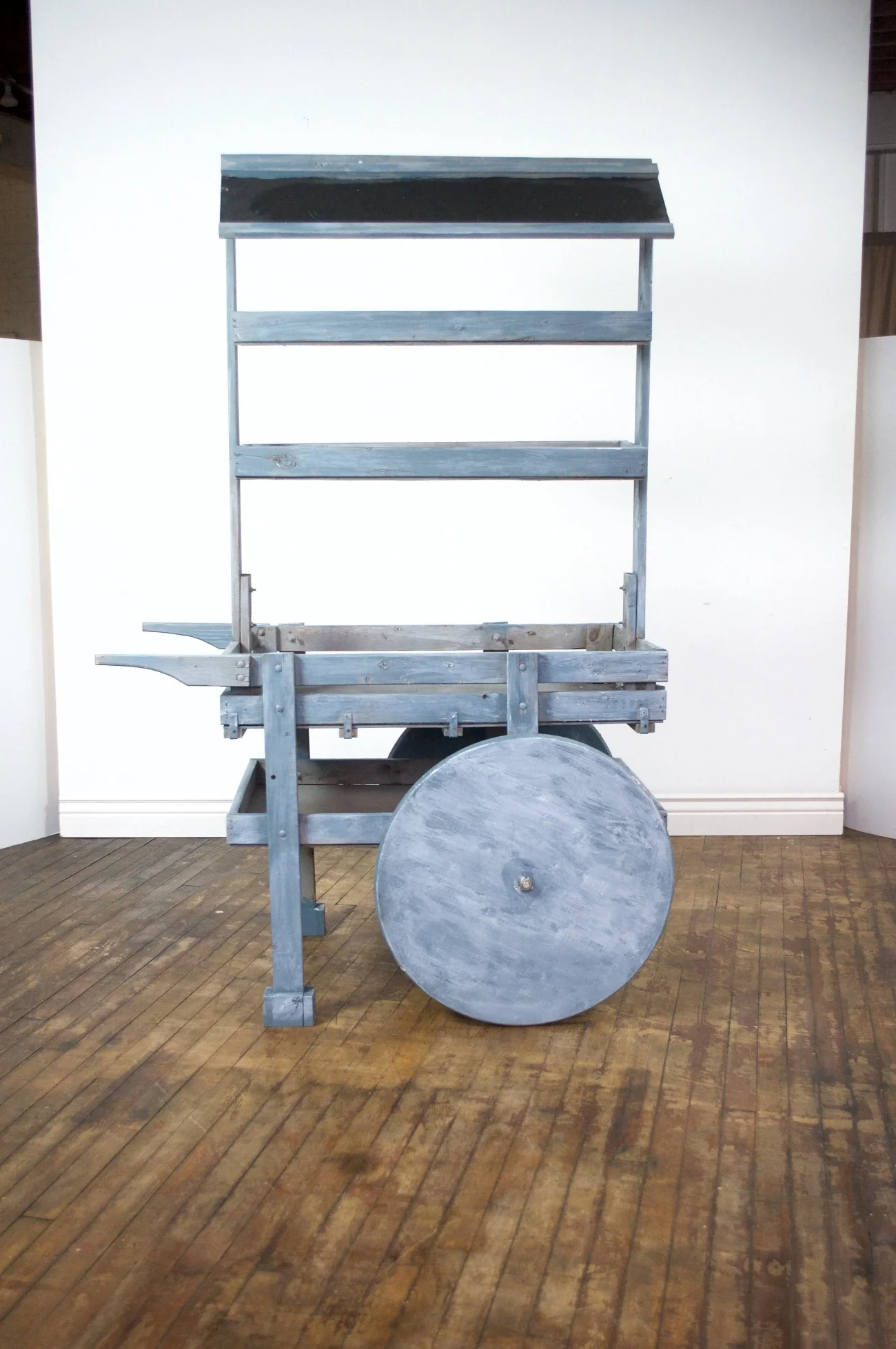 The Wheeled Serving Cart is painted a grey/blue with a chalky finish. It has two upper shelves and two lower. The top awning is painted with chalkboard paint, so you can write whatever you want to label your display.